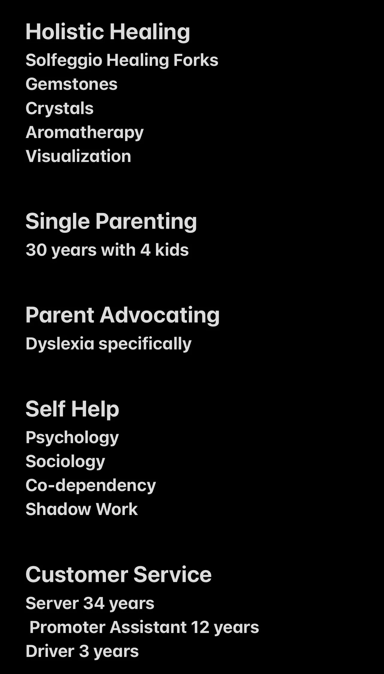 Self Taught: Astrology, Aromatherapy, Gemstones & Crystals, Holistic Healing, Self HElp, Co-Dependency, Solfeggio Healing Forks, Divination, Metaphysics, theology and home businesses.